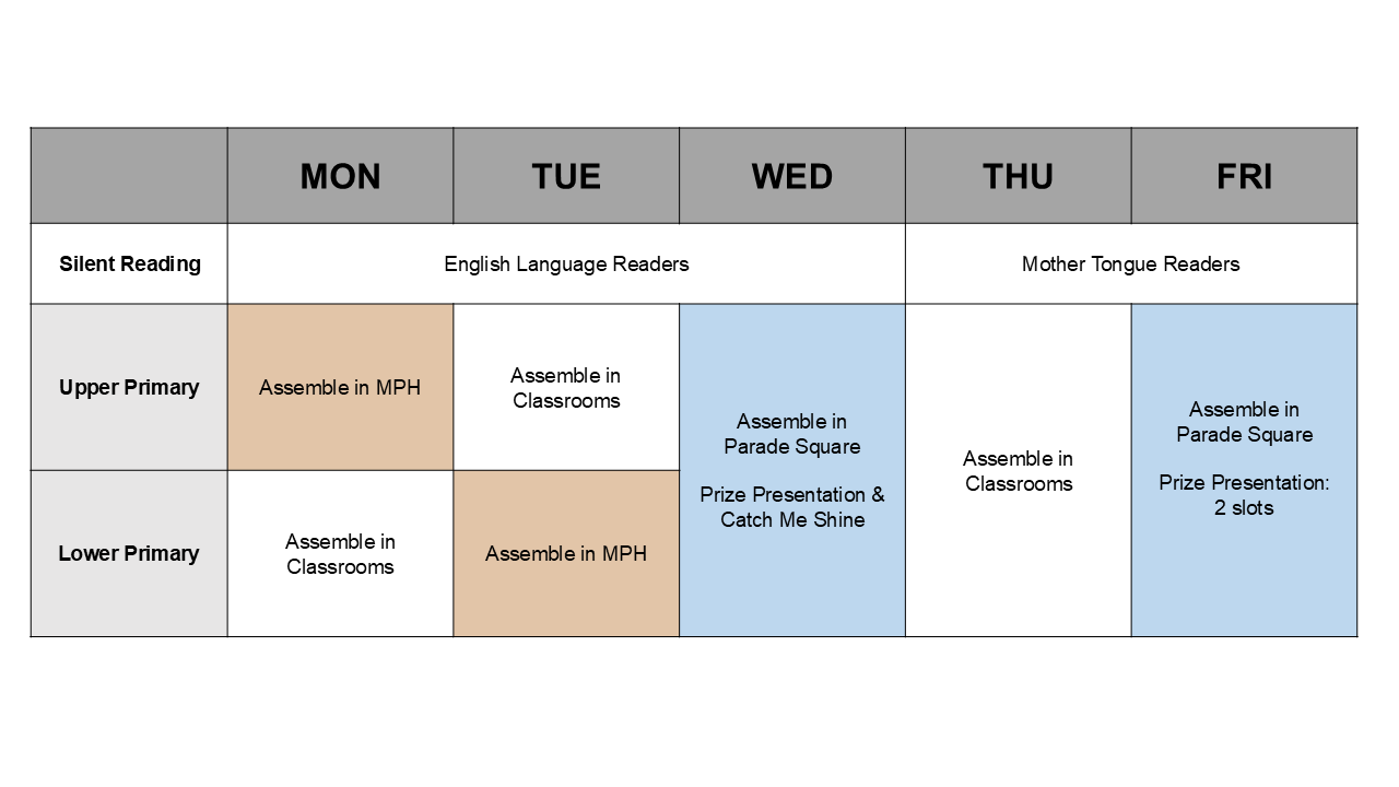 All students are to be seated by 7.15 a.m. in their respective classroom for the Silent Reading Programme.
