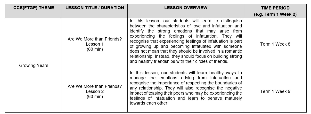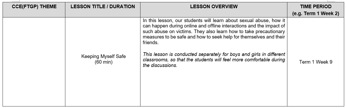 7. SEd lessons are taught as part of CCE (FTGP) at Primary 5 and 6. Through these lessons, our students will learn healthy ways to manage the physiological, social and emotional changes in their growing years. They learn to build healthy and rewarding relationships with others, including those with members of the opposite sex. Students are also guided to make wise, informed and responsible decisions to keep themselves safe from sexuality-related risks.