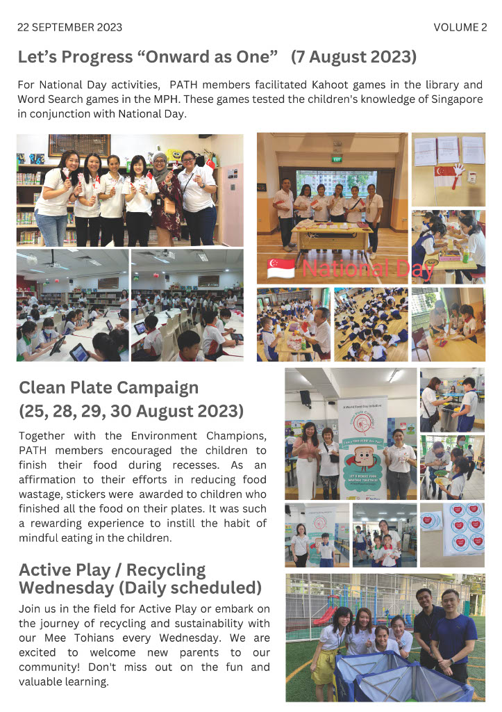 Mee Toh School's parent support group, Parents As Teacher Helpers (PATH), was formed in 2006. Since then, our PATH has grown from strength to strength with more than 300 current members. Our PATH members work with the school to support various programmes and initiatives, such as Active Play, Weekly Recycling Programme, commemorative events (e.g., Laba Festival, Total Defence Day), and learning journeys to enhance and deepen the holistic education of Mee Tohians. PATH members also interact and connect with one another through parent-child bonding activities or events meant solely for parents' participation.